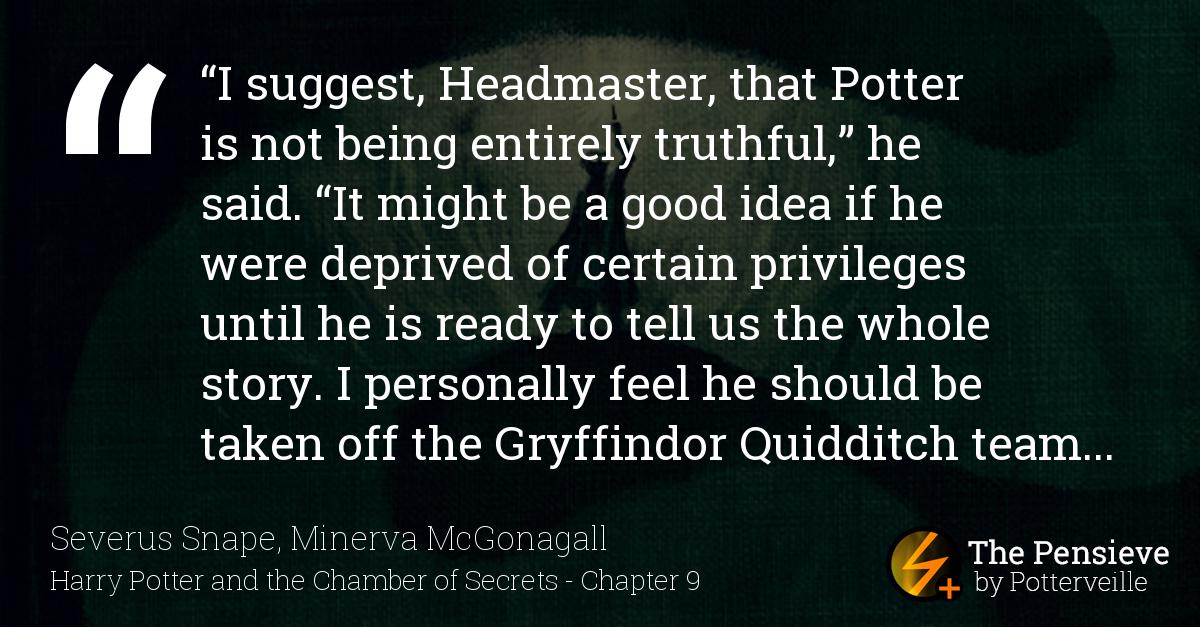“I suggest, Headmaster, that Potter is not being entirely truthful,” he said. “It might be a good idea if he were deprived of certain privileges until he is ready to tell us the whole story. I personally feel he should be taken off the Gryffindor Quidditch team until he is ready to be honest.”