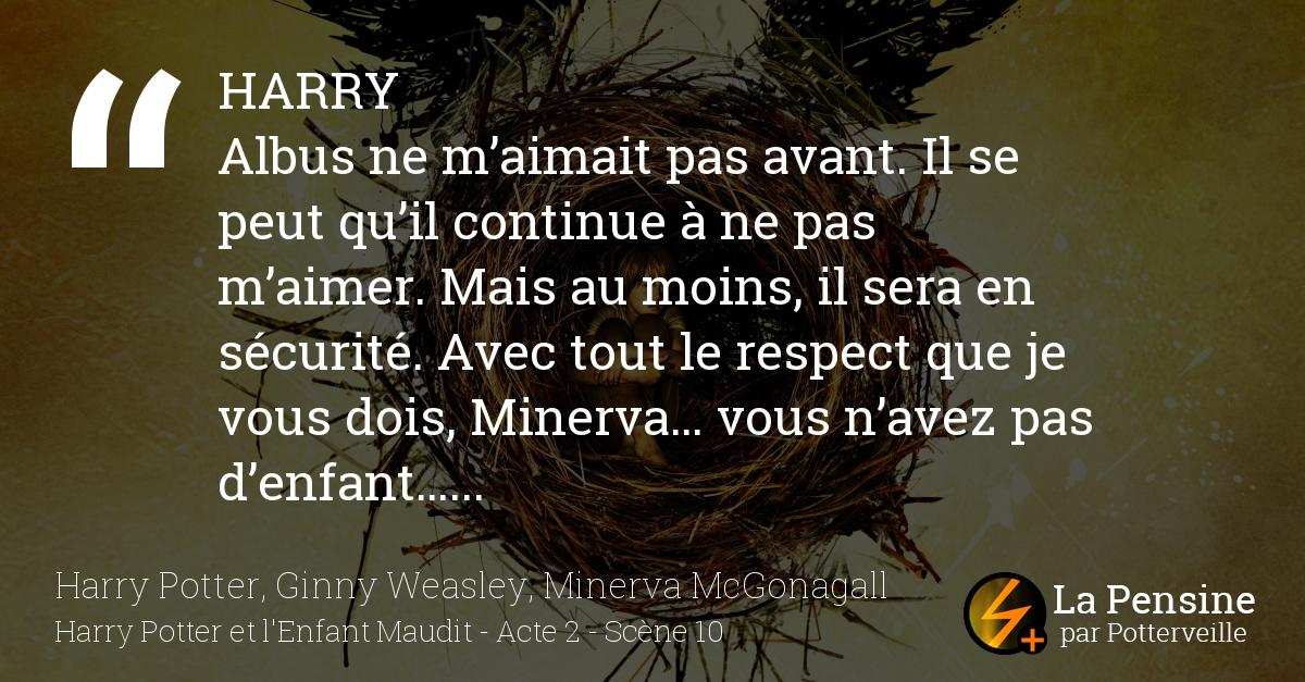 Albus ne m’aimait pas avant. Il se peut qu’il continue à ne pas m’aimer. Mais au moins, il sera en sécurité. Avec tout le respect que je vous dois, Minerva… vous n’avez pas d’enfant…