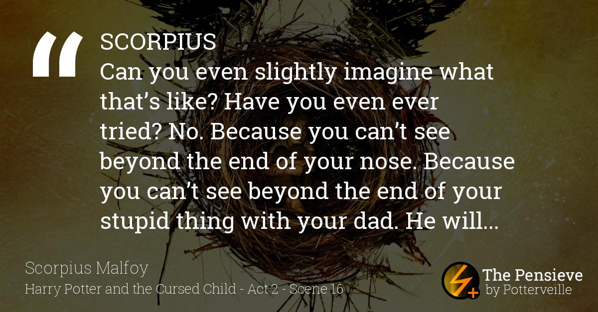 SCORPIUS Can you even slightly imagine what that’s like? Have you even ever tried? No. Because you can’t see beyond the end of your nose. Because you can’t see beyond the end of your stupid thing with your dad. He will always be Harry Potter, you know that right? And you will always be his son. And I know it’s hard, and the other kids are awful but you have to learn to be okay with that, because – there are worse things, okay?