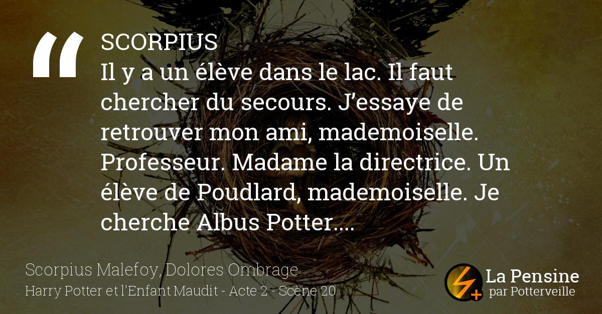 Il y a un élève dans le lac. Il faut chercher du secours. J’essaye de retrouver mon ami, mademoiselle. Professeur. Madame la directrice. Un élève de Poudlard, mademoiselle. Je cherche Albus Potter.