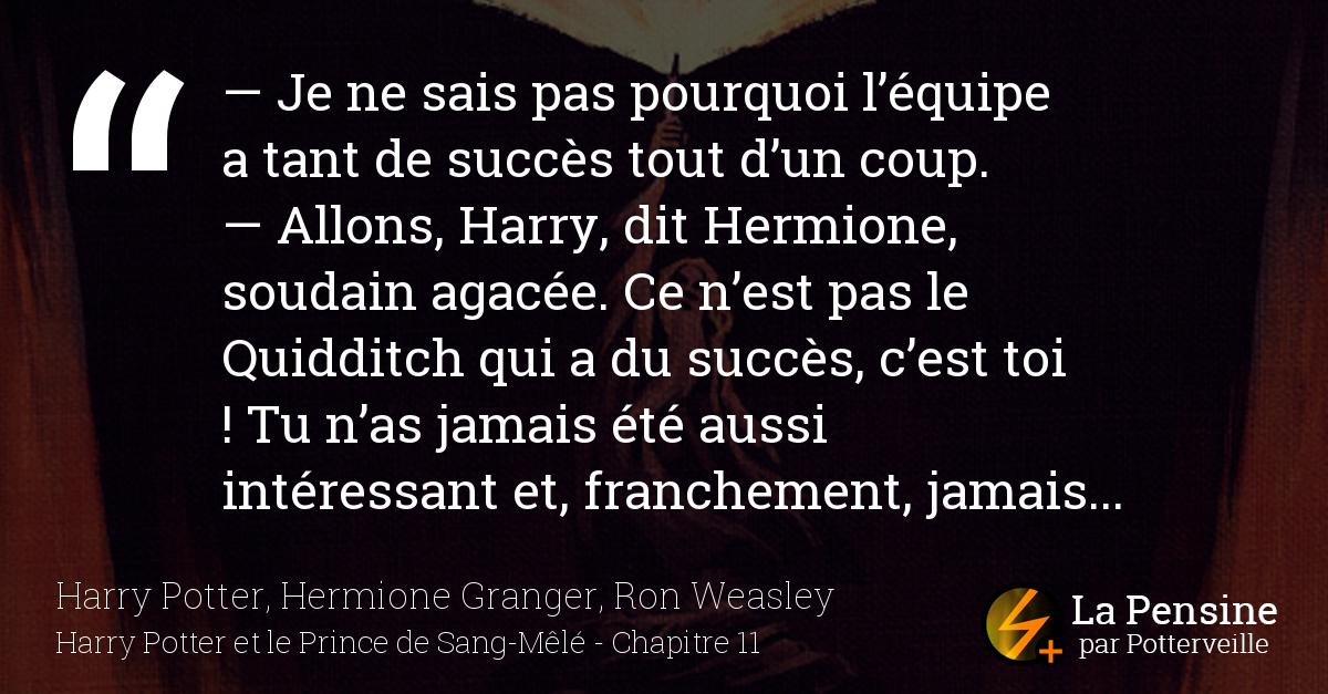 — Allons, Harry, dit Hermione, soudain agacée. Ce n’est pas le Quidditch qui a du succès, c’est toi ! Tu n’as jamais été aussi intéressant et, franchement, jamais aussi attirant.